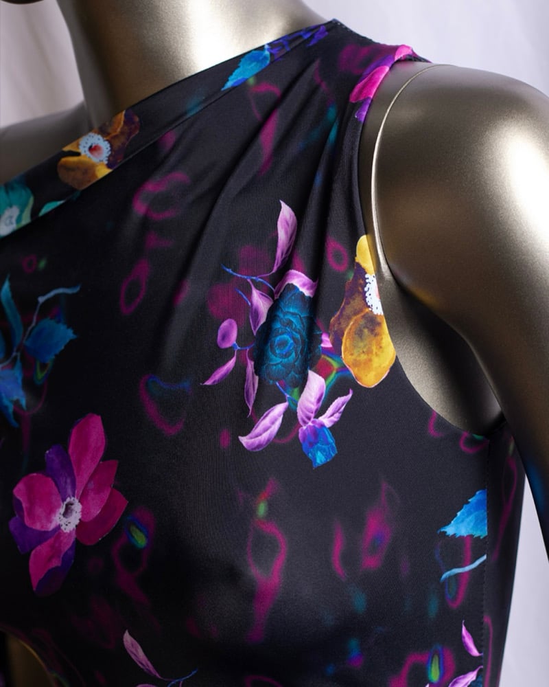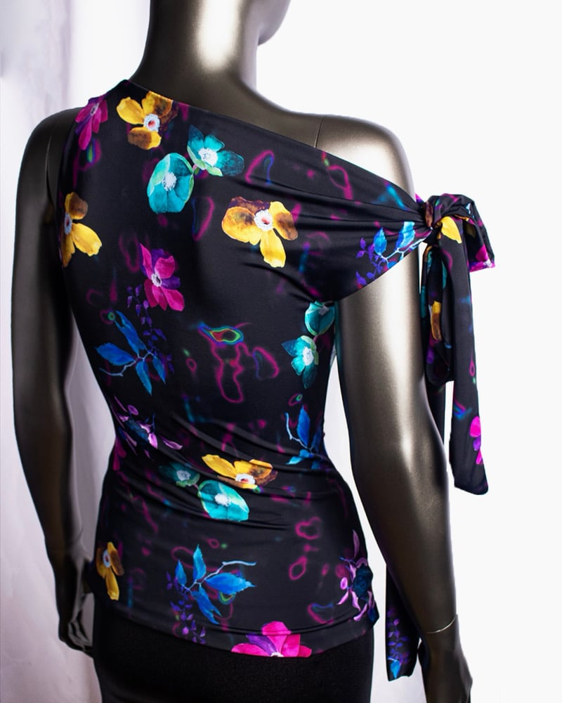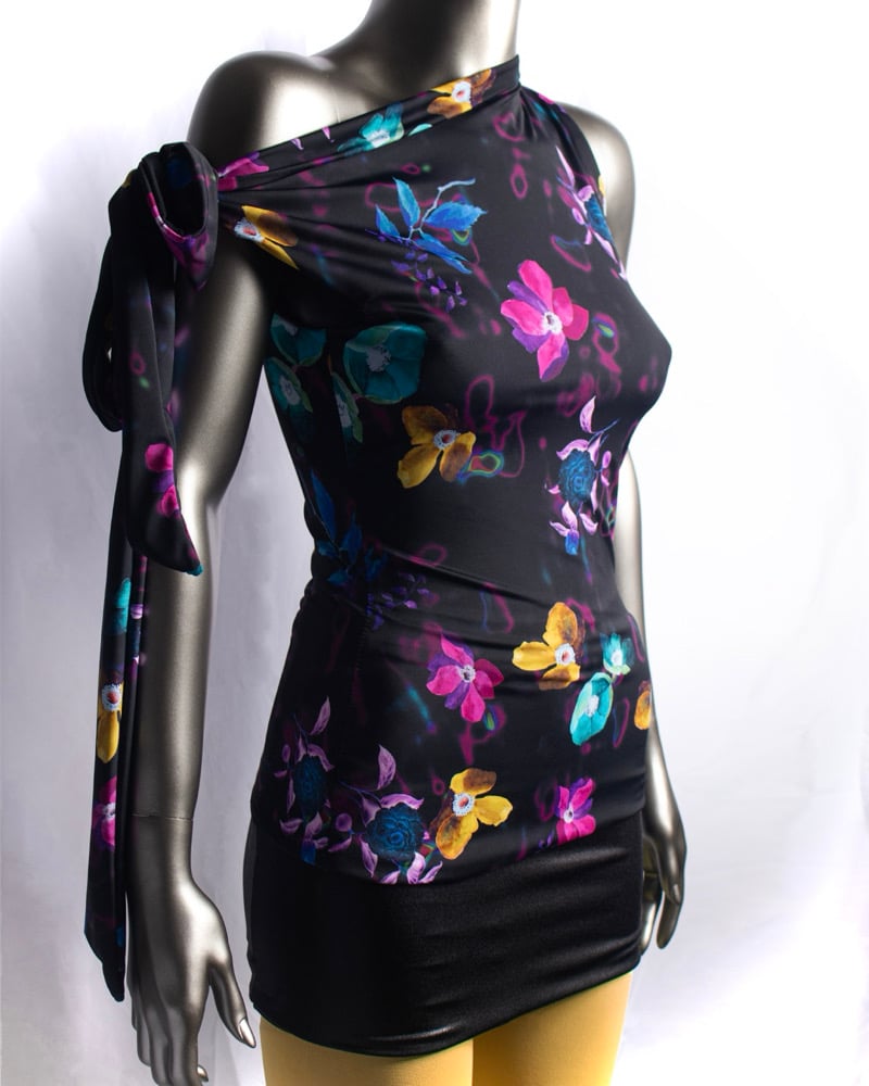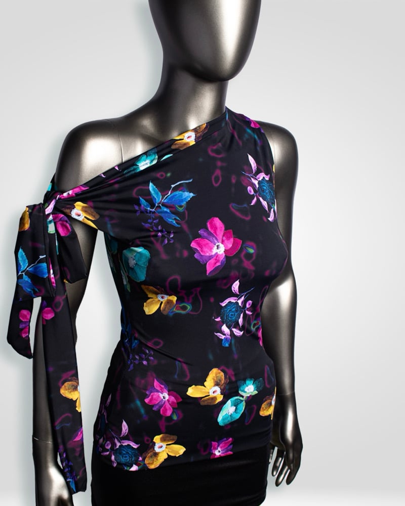 Turn heads in this one-shoulder stunner. With neon floral prints on a sleek black base and an artfully tied drape sleeve, Fever Flora is playful, provocative, and totally unforgettable.