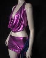 A hypnotic two-piece drenched in pink and electric blue metallic sheen. The cowl halter top cascades seductively while the draped mini skirt hugs and flatters. For the femme who leaves a mark without saying a word.
